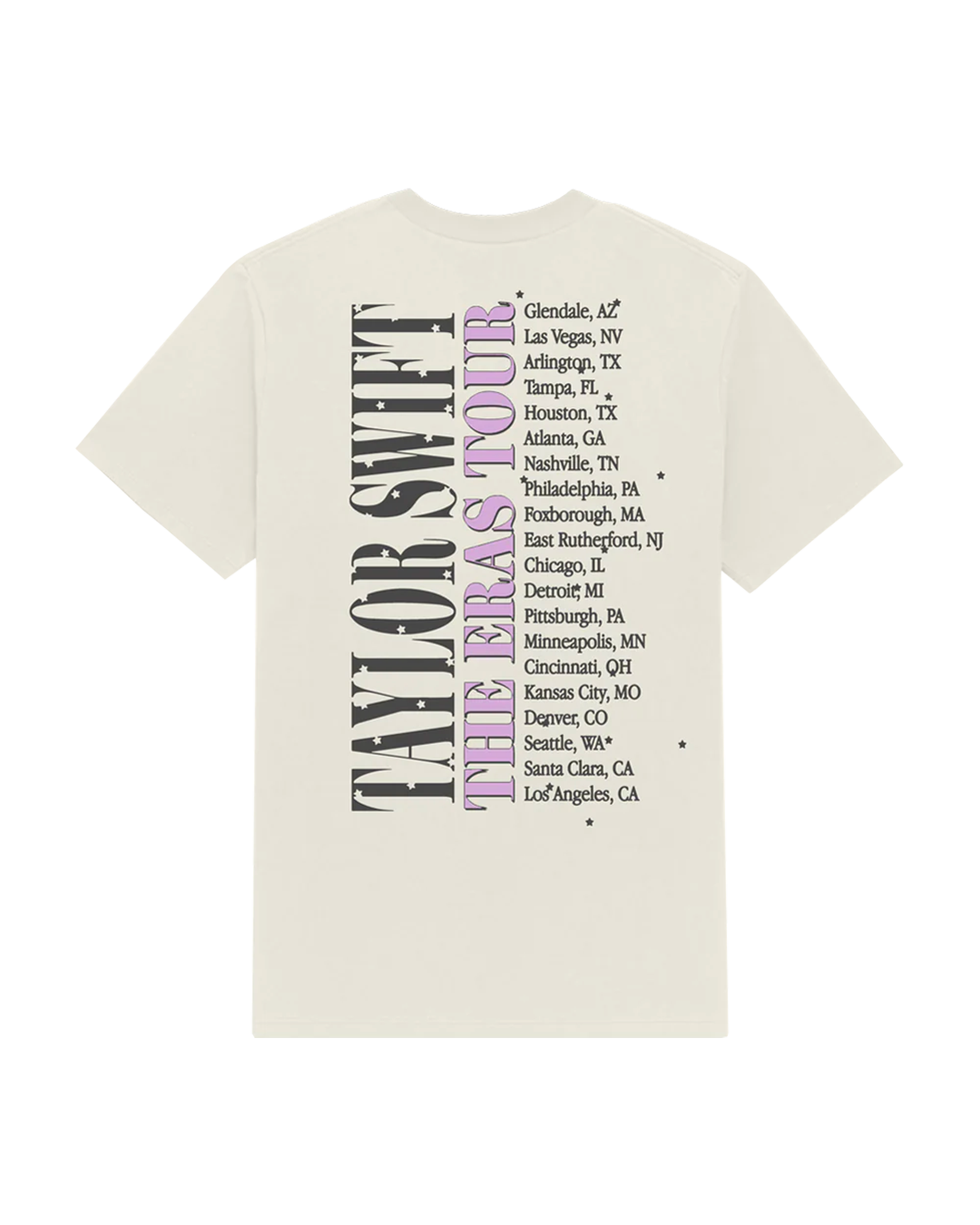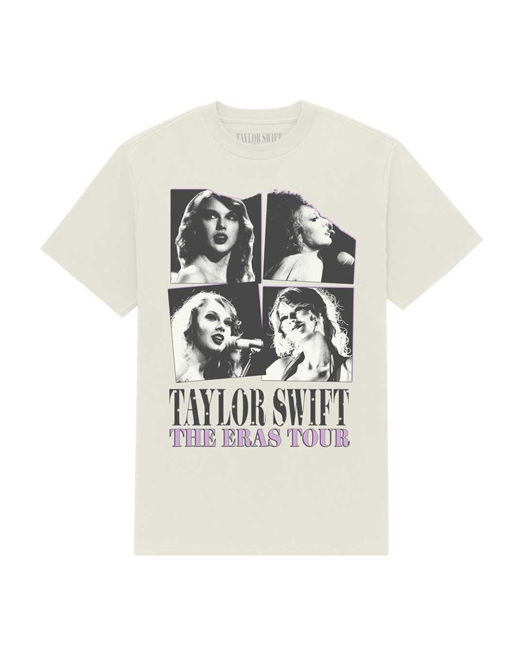 Cream t-shirt with Speak Now album era photos of Taylor Swift and "Taylor Swift | The Eras Tour" printed on front with "Taylor Swift | The Eras Tour" and tour locations printed on back.