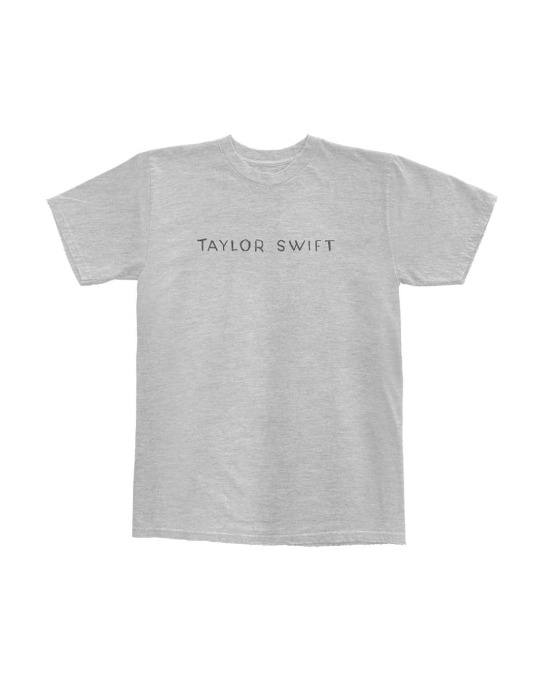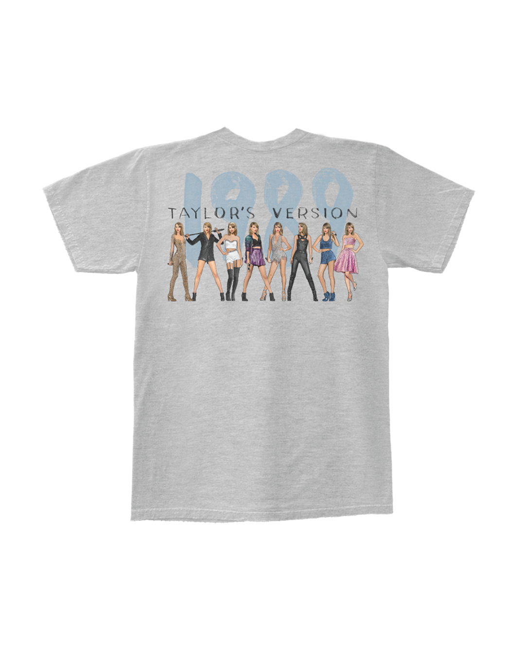 Gray t-shirt featuring "Taylor Swift" printed on front and "1989 Taylor's Version" with 1989 (Taylor's Version) Eras illustrations printed on back.