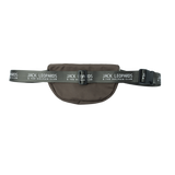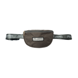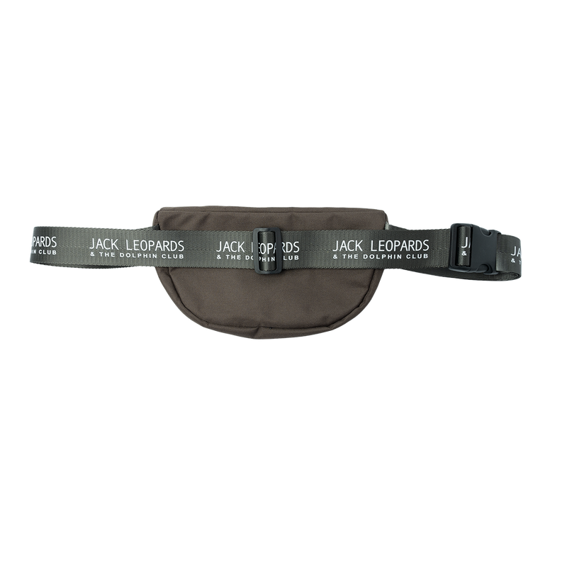 Brown zipper hip bag featuring "Jack Leopards & The Dolphin Club" embroidered on front woven label with "Jack Leopards & The Dolphin Club" repeating logo printed on adjustable strap with buckle closure.