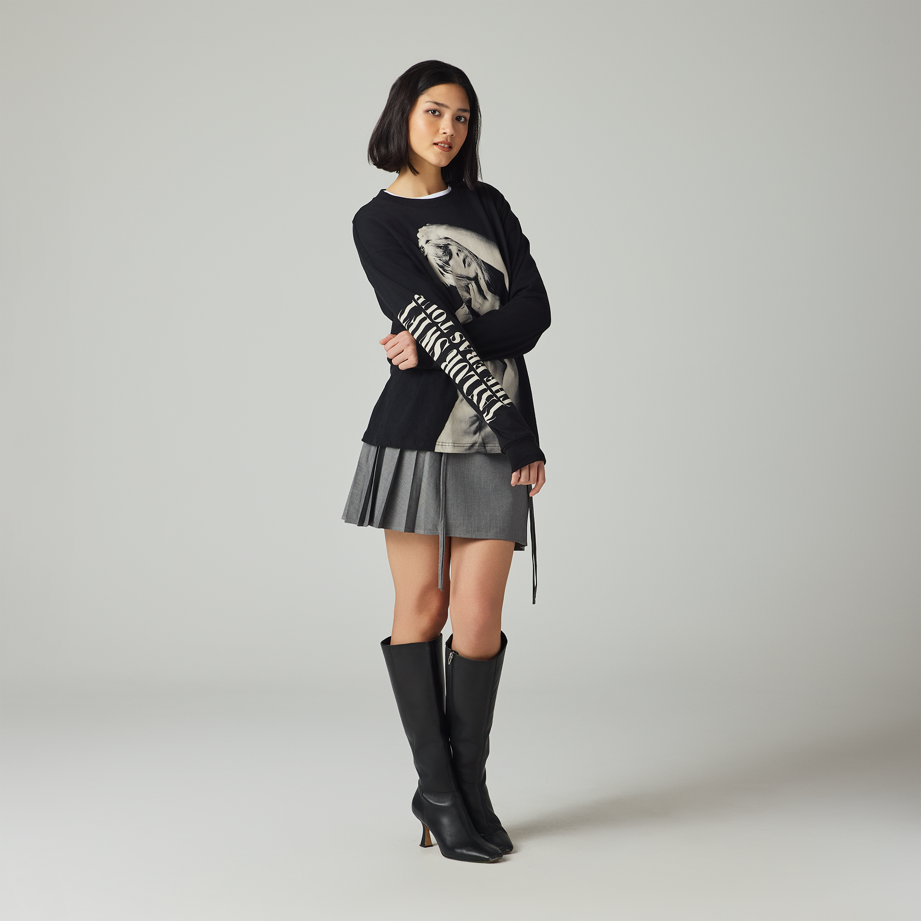 Black long sleeve t-shirt featuring "Taylor Swift The Eras Tour" printed on wearer's right sleeve and photo of Taylor Swift printed on front.