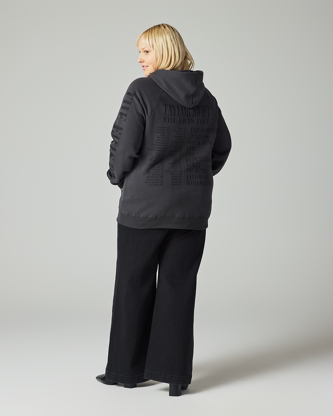 Black hoodie with front pocket featuring photos of Taylor Swift printed on front with "Taylor Swift" printed on wearer's right sleeve and "The Eras Tour" printed on wearer's left sleeve with "Taylor Swift The Eras Tour" tour locations through London, and Taylor Swift album titles printed on back.